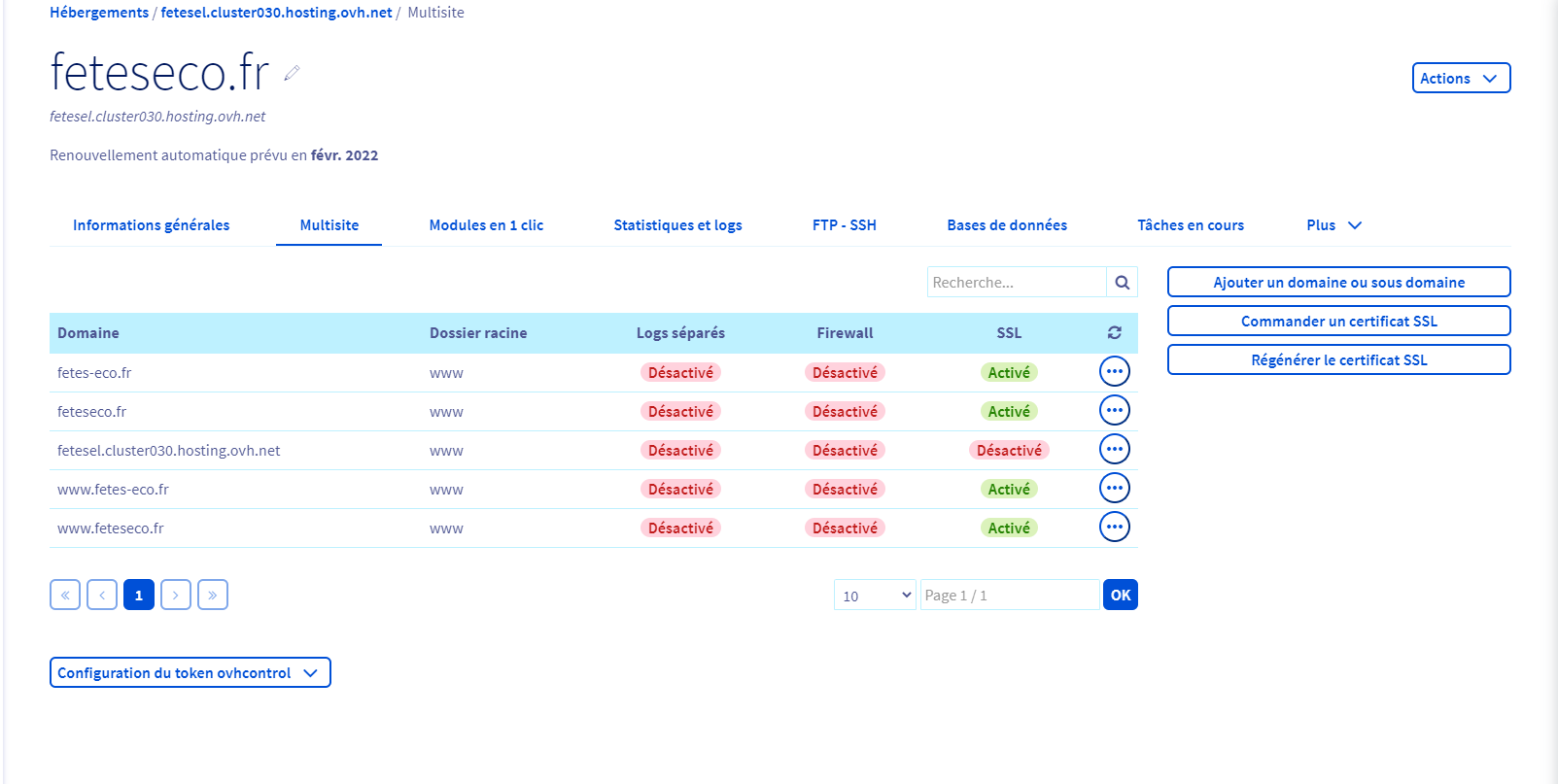 **Manager OVH > Web Cloud > Hébergement > VotreDomaine > Multisite**