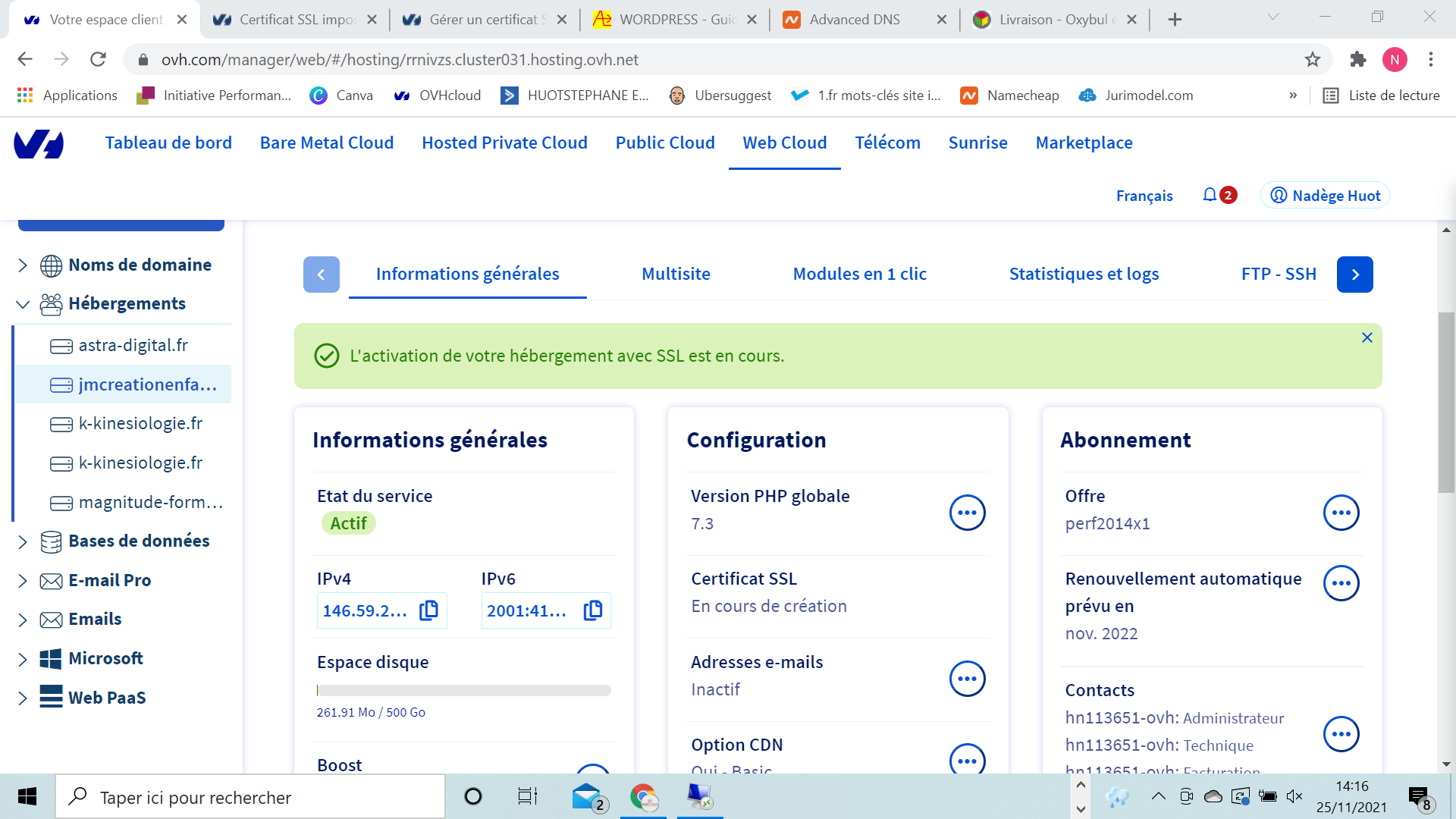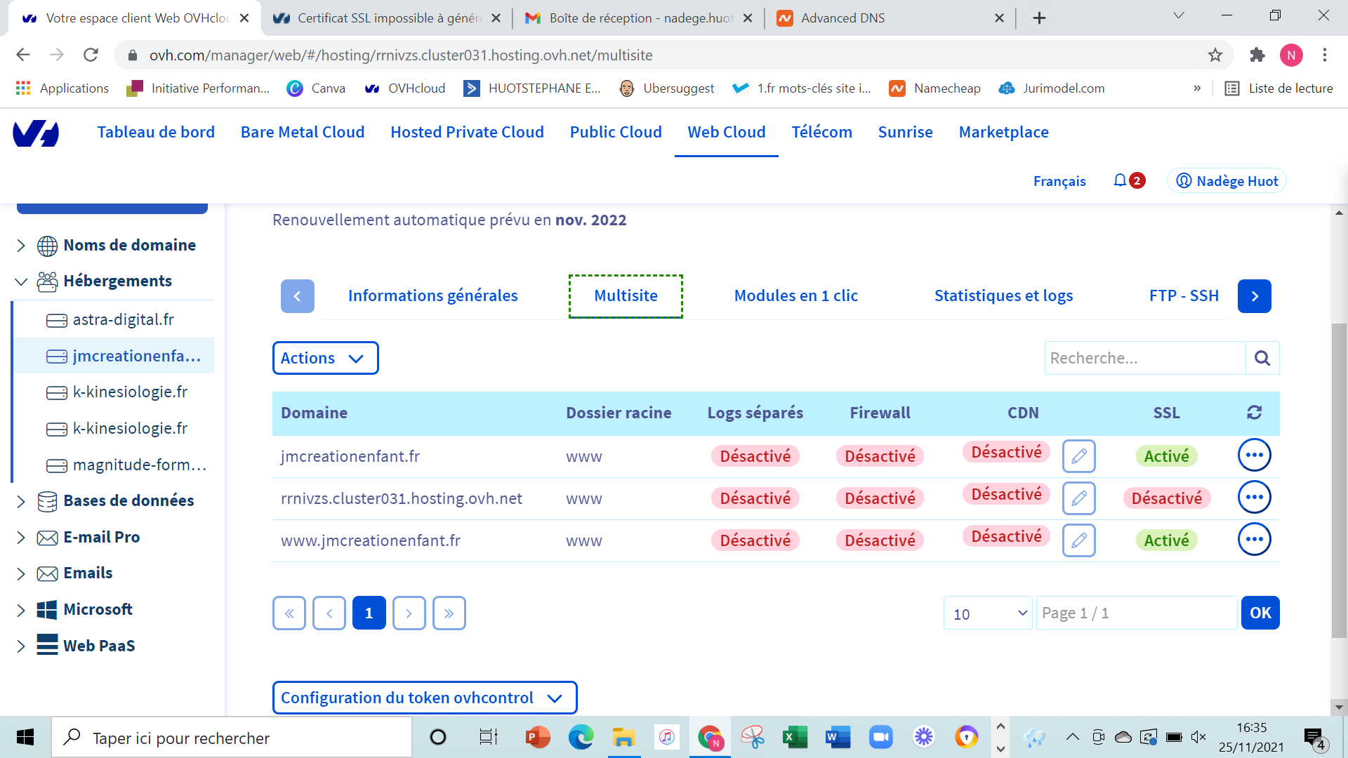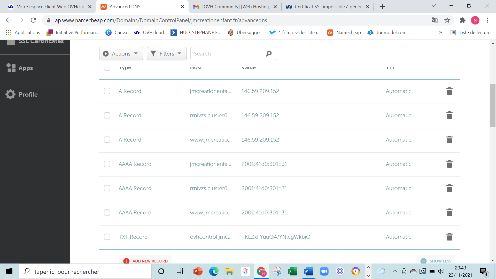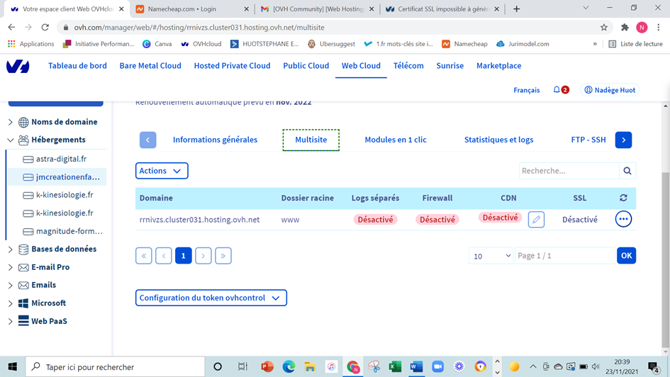 Comme tout le monde impossible de générer le certificat SSL (je précise que mon nom de domaine est chez Namecheap mais j'ai fait les changements de DNS demandés par OVH pour le récupérer). Le code erreur est toujours le même : Une erreur est survenue lors de la commande d'un certificat SSL. (No attached domain with ssl enabled or no attached domain that redirect on hosting IPs, please use hosting IPs in your domain zone)