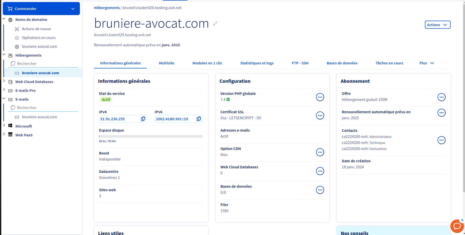 Et voici mon écran dans la partie Hébergement (qui n'est donc pas la même ip que mon paramétrage de base ) :
