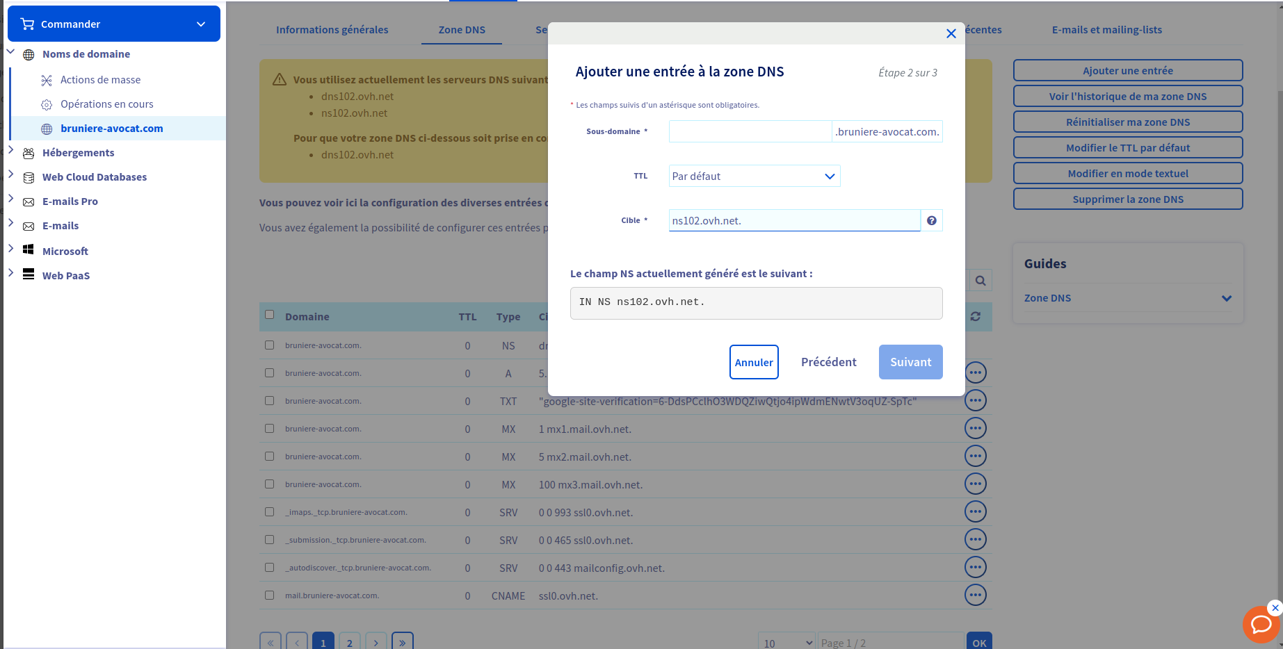 Je n'y arrive pas ! Je clique sur ajouter une entrée puis je sélectionne NS mais quand je met ns102.ovh.net. je ne peux pas cliquer sur suivant ...