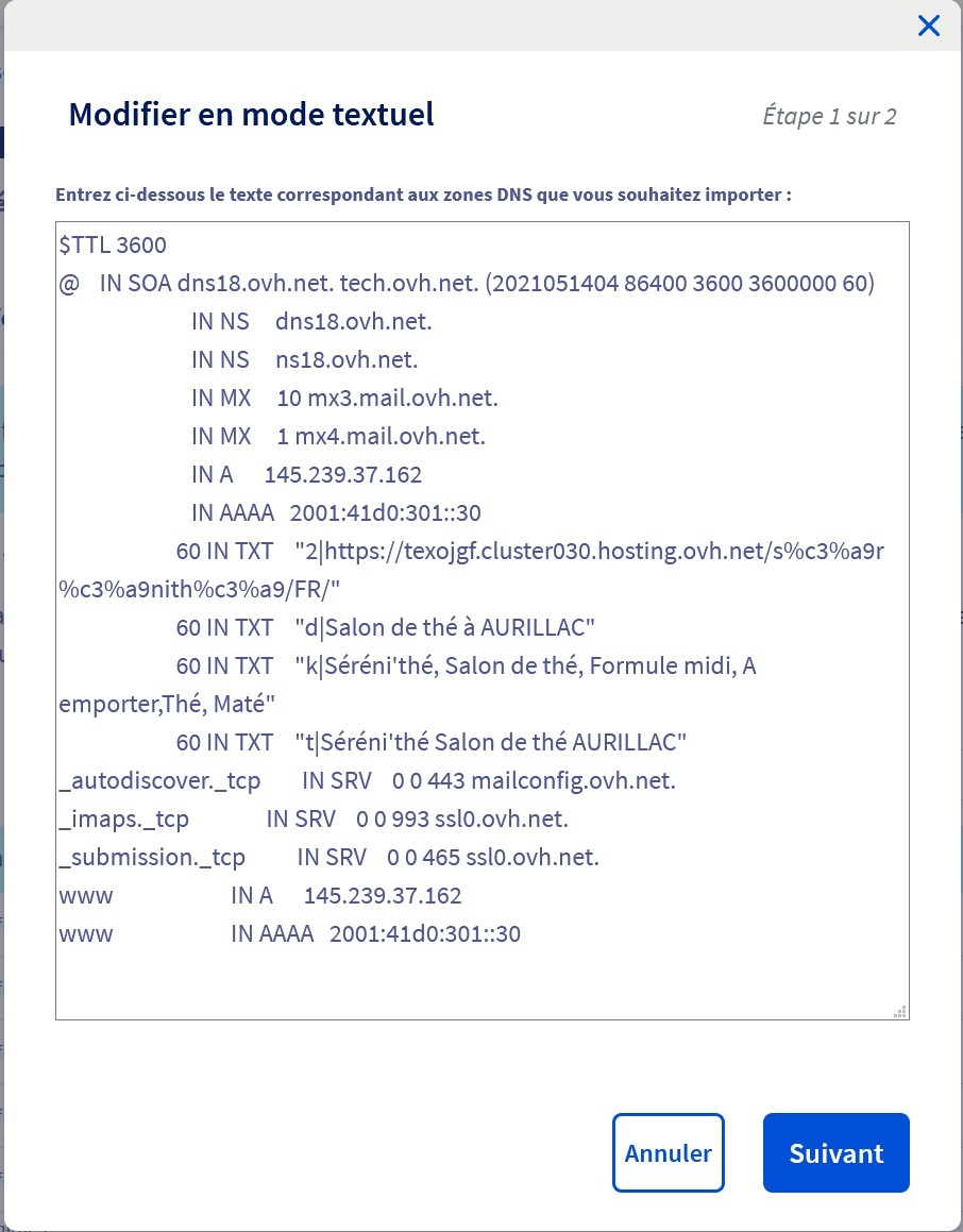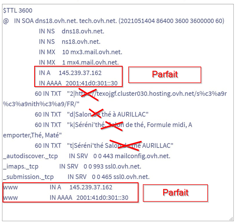 7) dans la zone DNS vous avez 2 enregistrements 'A' avec 213.186.33.5. Changez cette adresse par 145.239.37.162