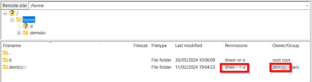 Votre répertoire racine (/home) doit avoir les permissions suivantes: "drwx---r-x"