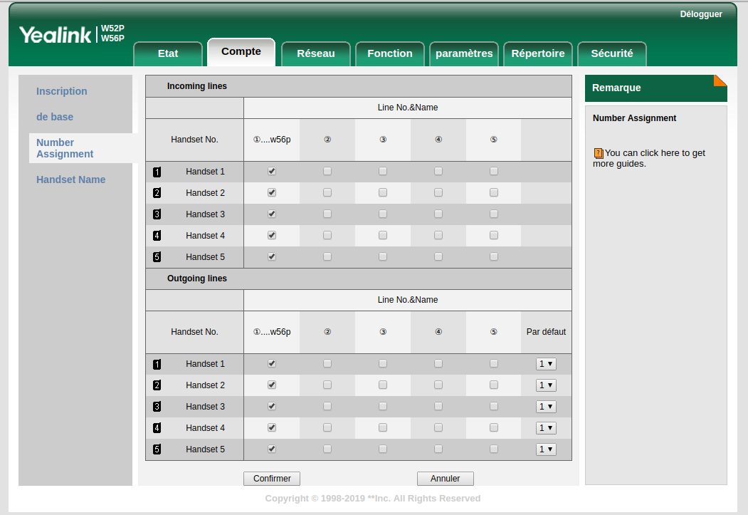 Vérifiez que les cases correspondant à vos combinés (Handset 1, Handset 2, etc...) sont bien cochées dans la 1ère colonne pour chaque tableau. Cliquez ensuite en bas sur "Confirmer".