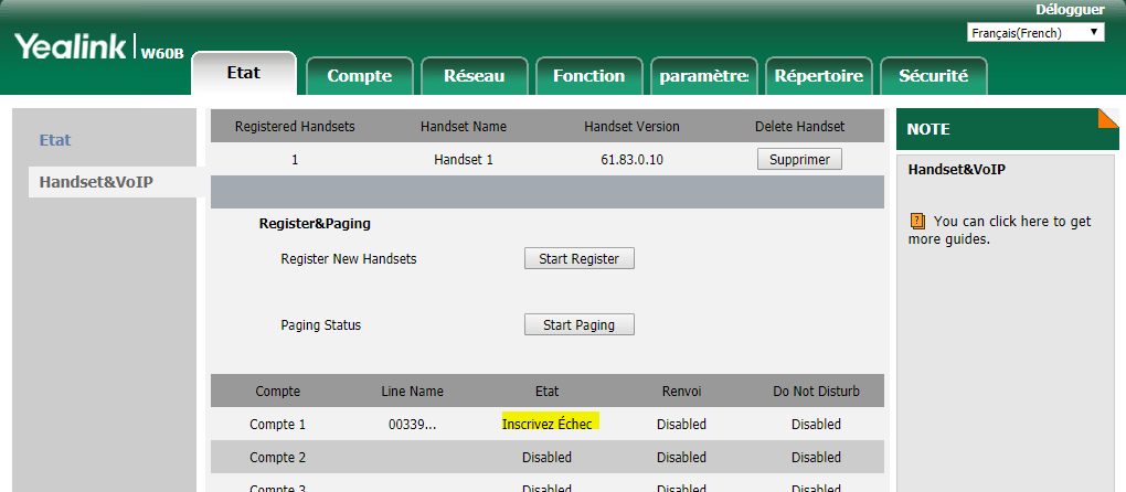 Merci pour votre réponse. J'ai suivi vos conseils mais sans résultat. Je soupçonne en effet un défaut d'enregistrement mais je ne m'en sors pas. Voici une capture d'écran de l'interface Yealink qui semble confirmer cette hypothèse.