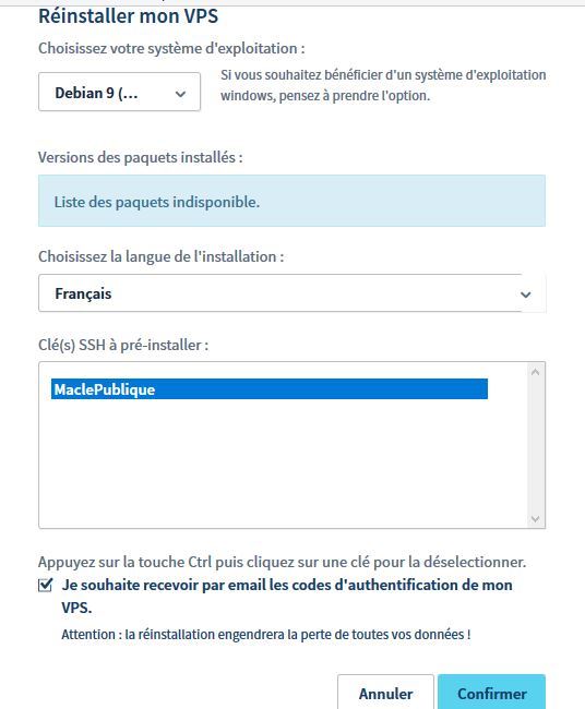 Je lance la réinstallation de mon VPS, en sélectionnant ma clé SSH :
