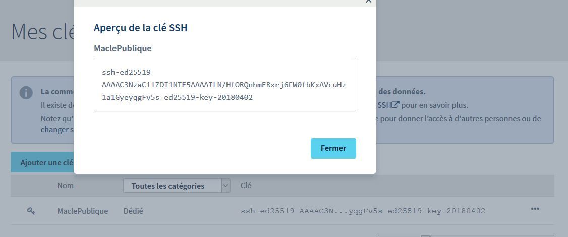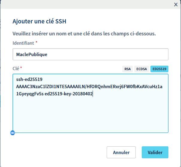 Du coup, je suis allé dans "Mon compte" > "Mes clés SSH" > Ajouter une clé SSH > Dédié