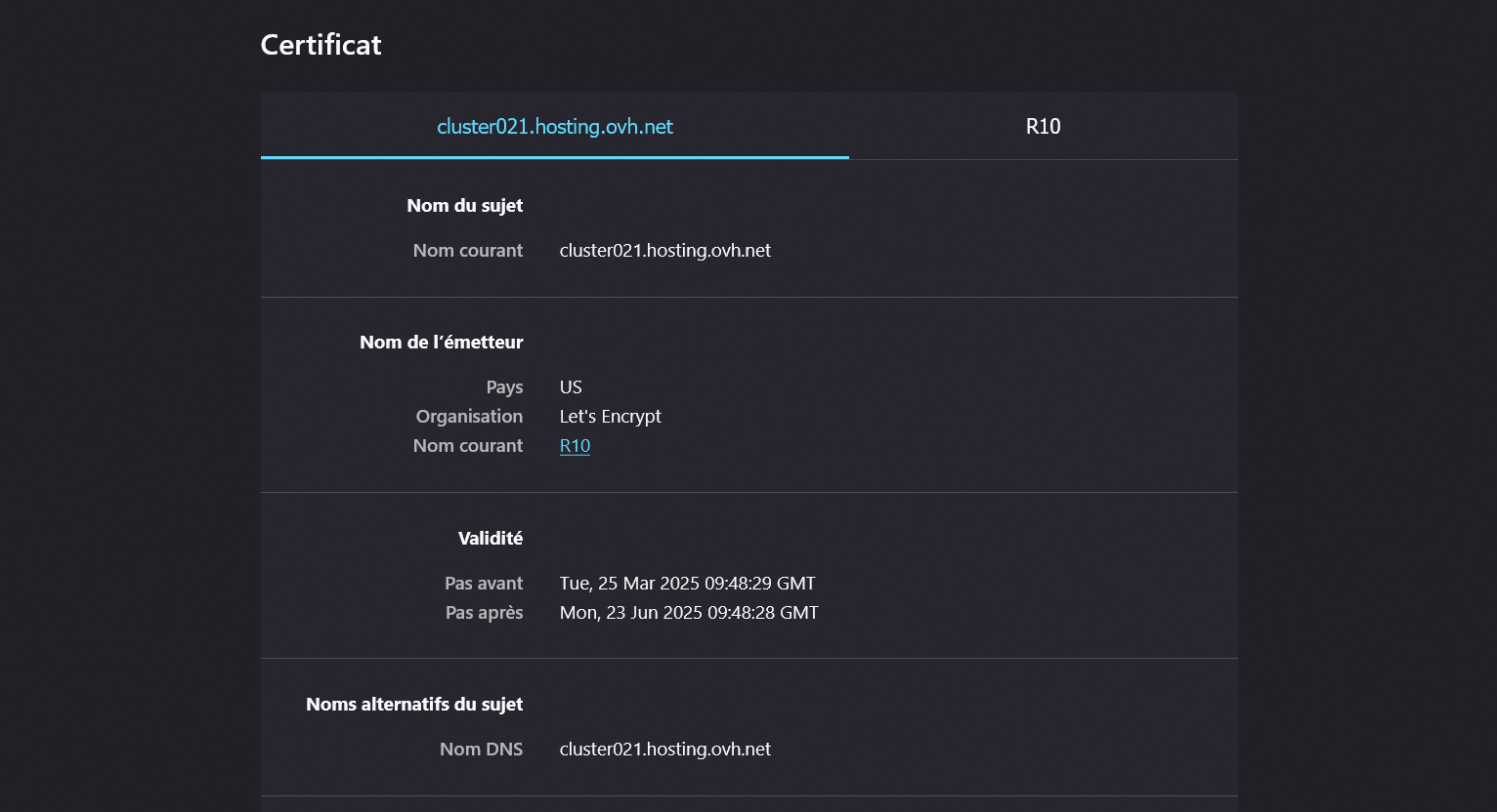 A ce propos, mon site "siwf.eu" est maintenant OK je crois, mais j'en ai un autre, "siwf.shop", qui ne veut pas du certificat SSL: à chaque fois que je demande le certificat, il me met "en cours de création", je peux attendre 20 minutes, il revient à "NON", je ne sais pas pourquoi...