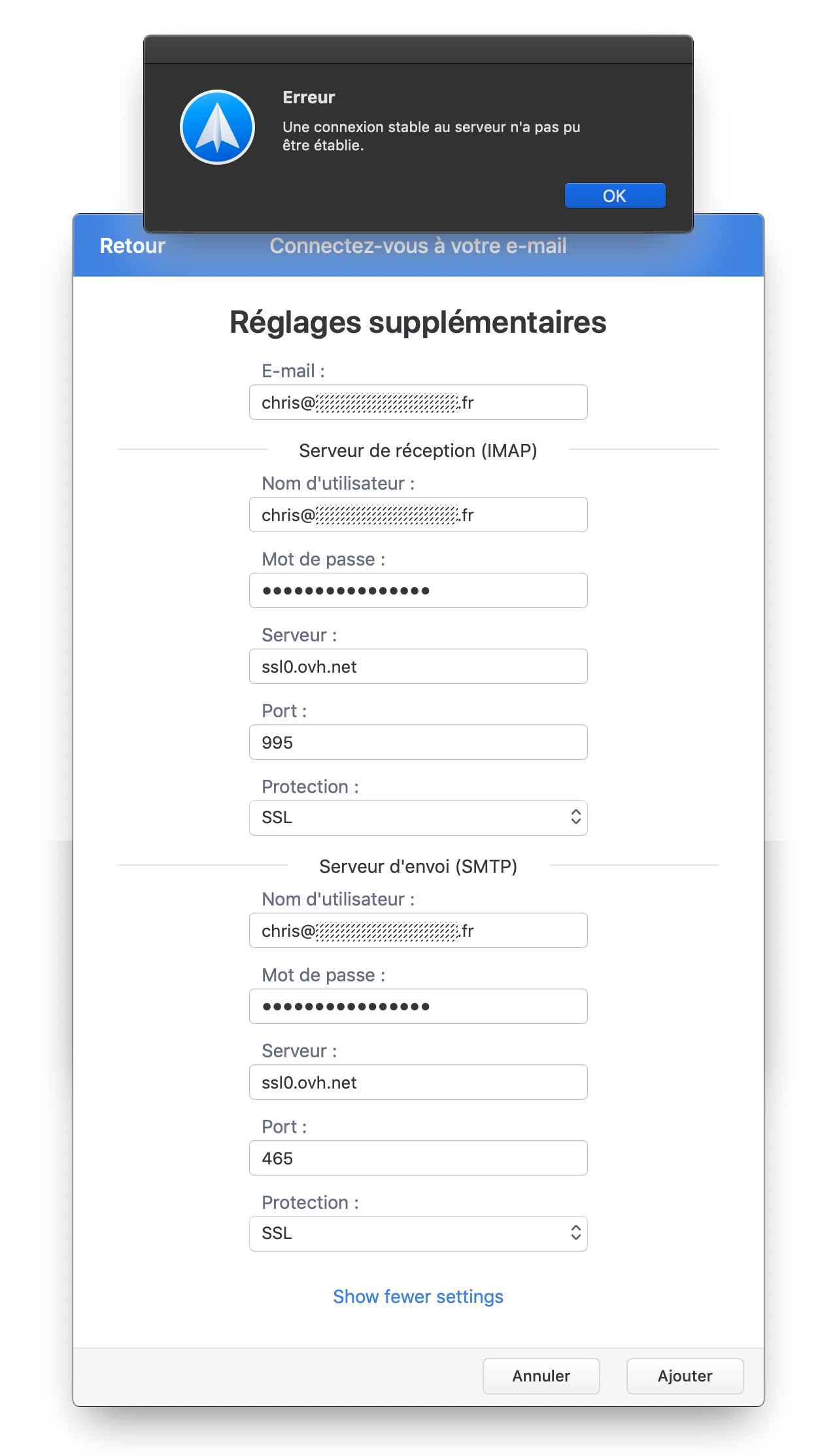 Je ne sais pas si tu as résolu ton souci. J'ai pour ma part appliqué la solution de @Fritz2cat avec en supplément l'adresse du serveur ssl0.ovh.net, et ça a fini par marcher. Toutefois, j'ai du m'y reprendre a deux fois en fermant la fenêtre de création de compte entretemps. Lors de ma première tentative, j'avais rentré les mauvaise informations, peut-être que cela a impacter les tentatives de connexions suivantes.