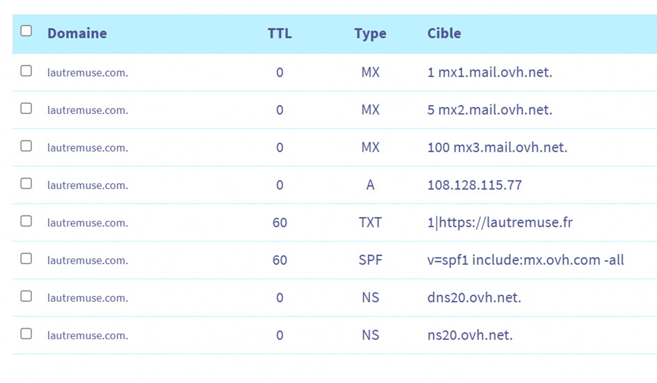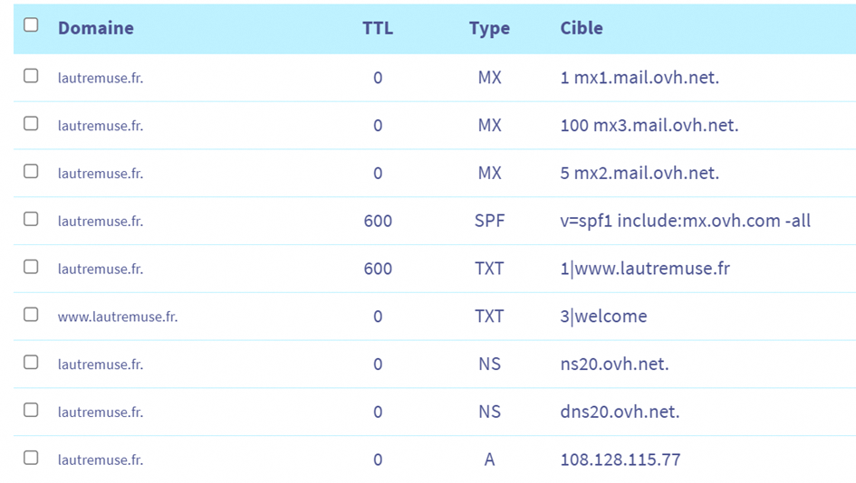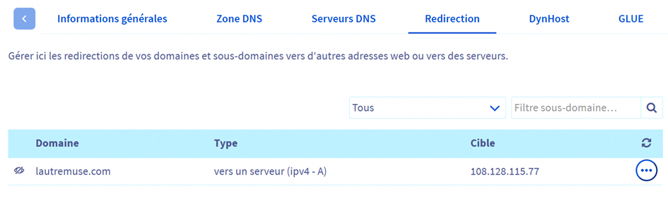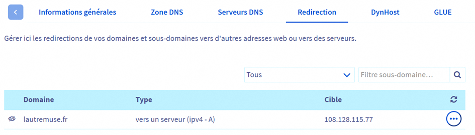 Étape 1 sur 5 : Cliquez sur lautremuse.fr sous la section "Domaines" puis sur l'onglet "Zone DNS"