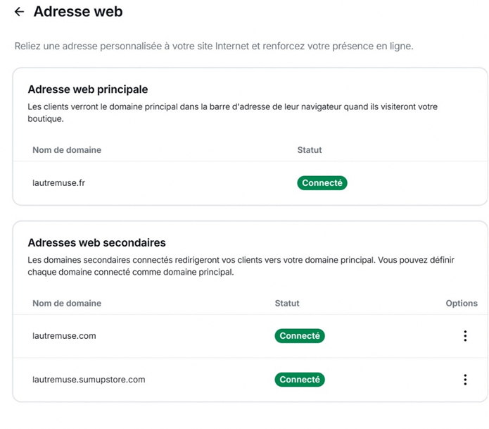 Mon nom de domaine est lautremuse.fr . Quand je le tappe sur internet cela me dirige bien vers la boutique sumup. Mais cela ne fonctionne pas pour lautremuse.com ni les dérivés avec www.