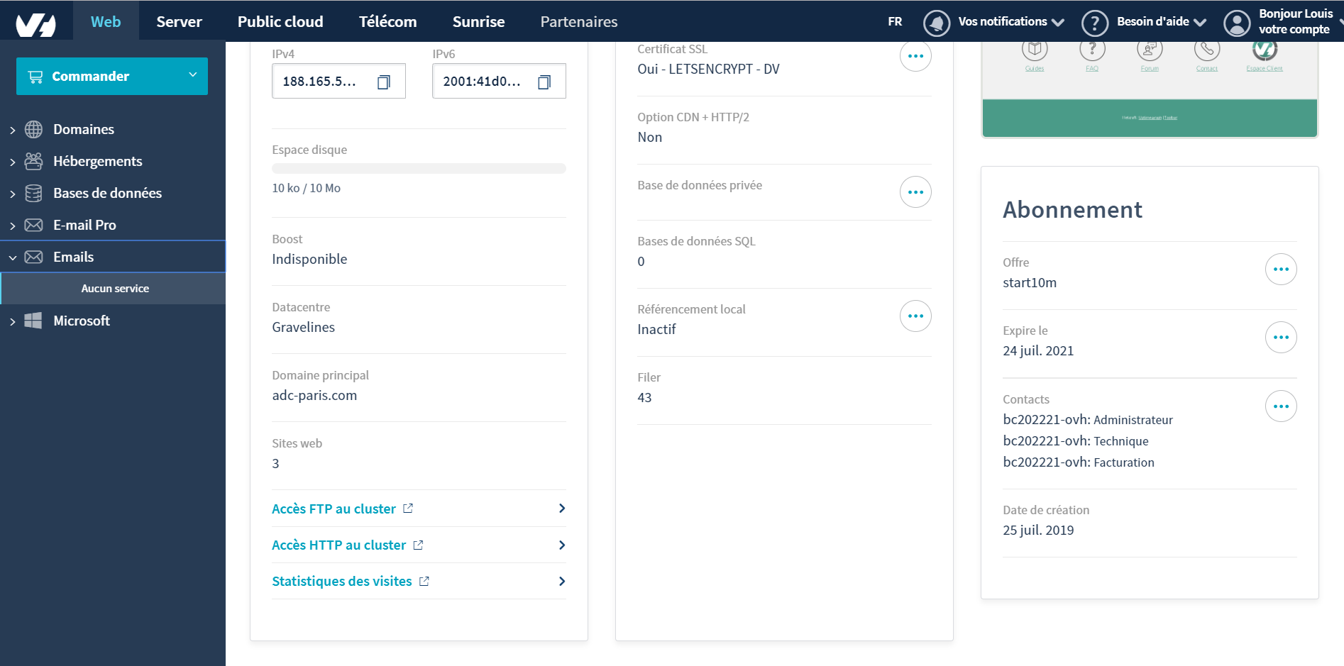 Je possède une offre Start 10Mo avec mon nom de domaine et l'hébergement associé.