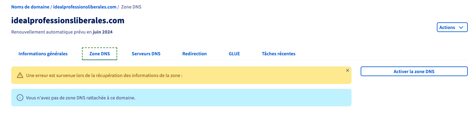 Voilà l'erreur quand je clique sur "activer ma zone DNS" :