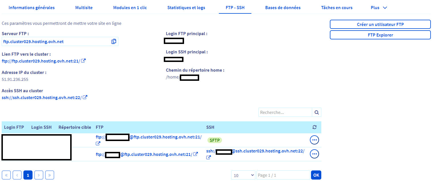 Dans Filezilla > Hôte essaye en remplaçant **ftp.clusterxxx.hosti...** par **ssh.clusterxxx.hosti...**