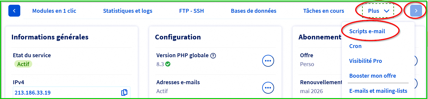 Dans mon espace je vois dans la rubrique hébergement, onglet informations générales > configuration adresses e-mails : actif mais je ne vois nulle part "scripts email"