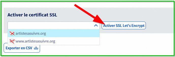 Je procède ainsi, je passe par l'écran en capture ci-jointe ("Nouvel onglet SSL"). Je ne vois rien d'autre à faire que cocher les deux entrées du menu déroulant puis cliquer sur le bouton Activer SSL Let's Encrypt. Si j'essaye par "Multisite", que je fais modifier, alors certes comme dit