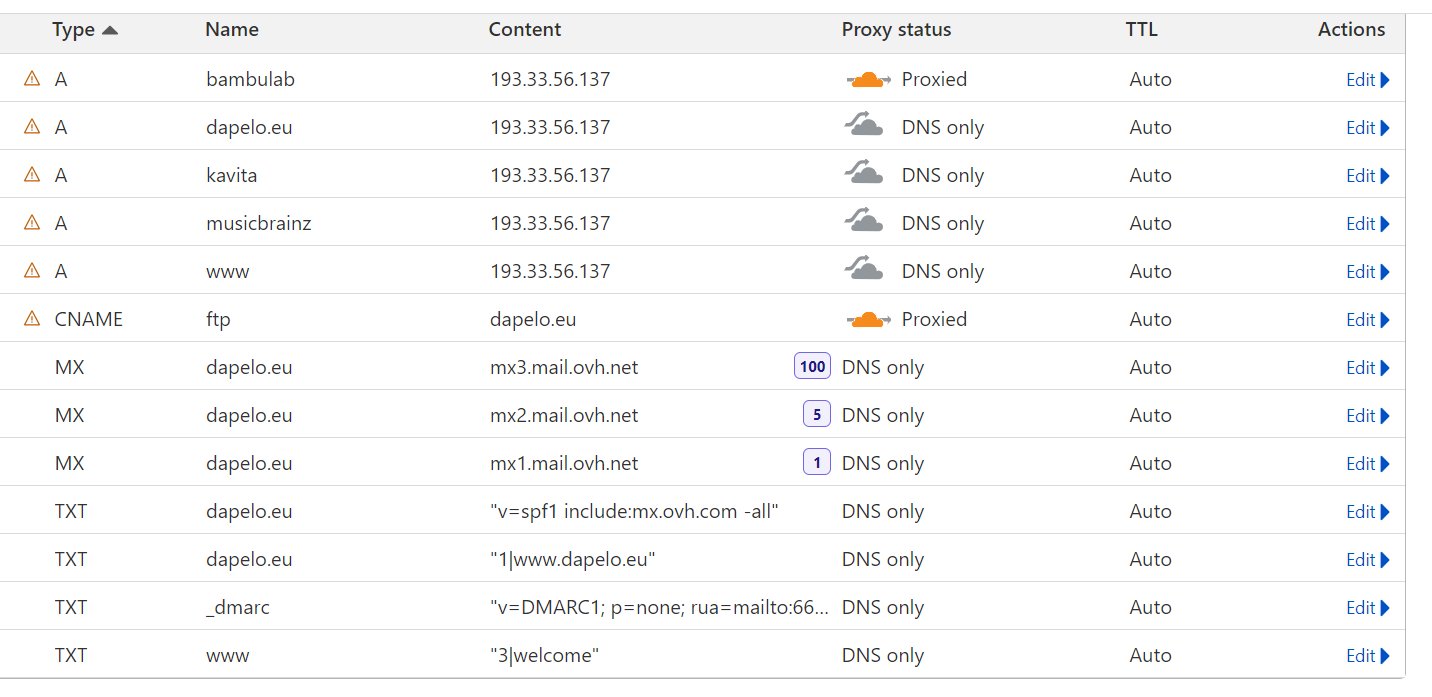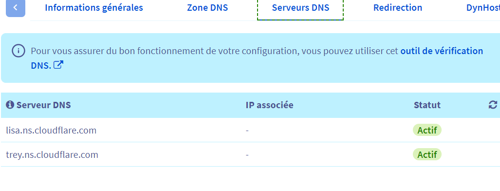 Ils sont donc bien configurés pour Cloudflare. La zone DNS sera donc à modifier et configurer chez Cloudflare