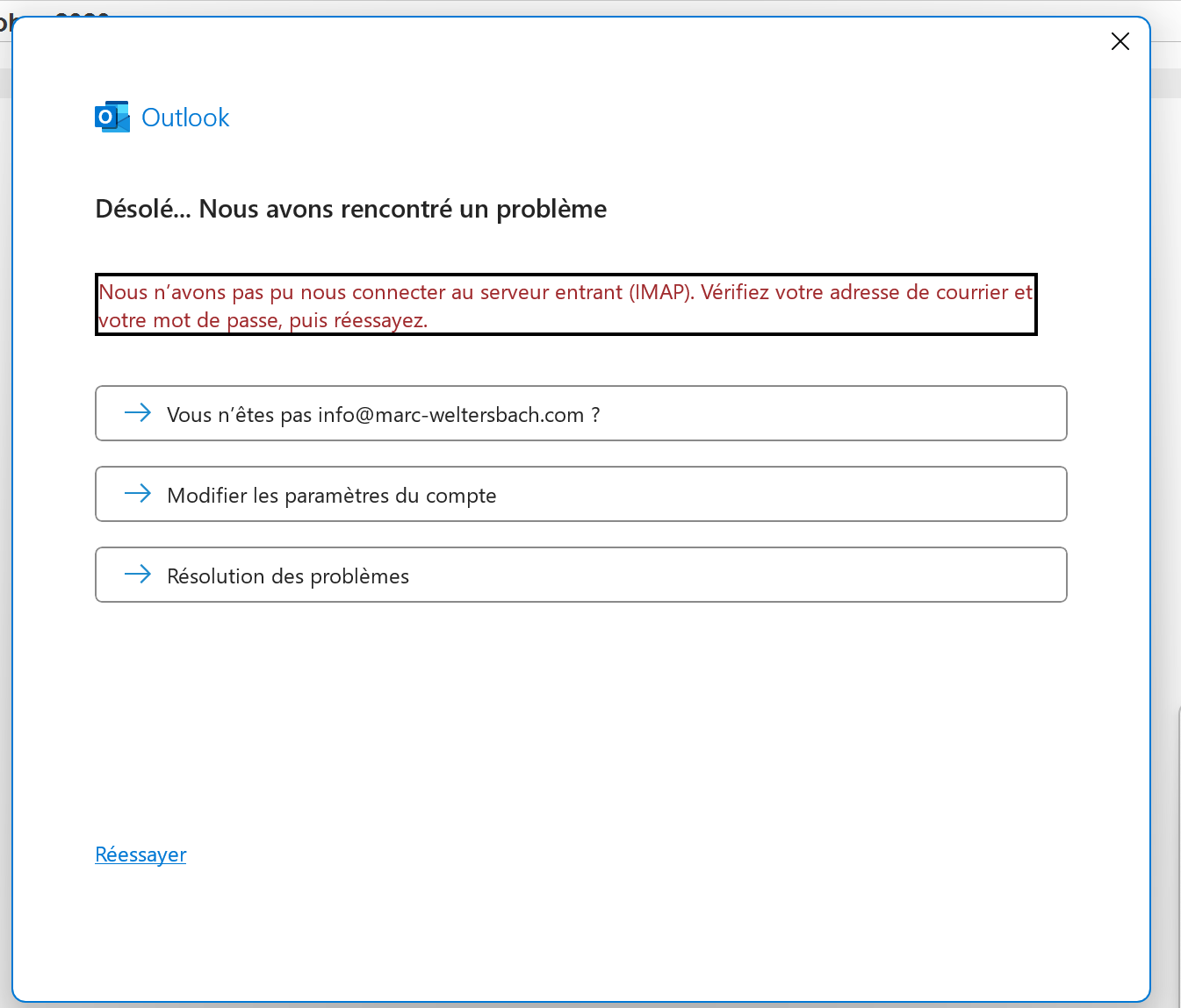 Je suis passé d'un MX Plan à un hosted exchange. Depuis je ne peux plus configurer mon adresse email dans mail pour windows ou outlook (par microsoft 365 ou directement par l'app).