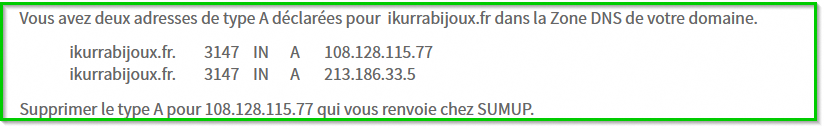 Vous avez deux adresses de type A déclarées pour  ikurrabijoux.fr dans la Zone DNS de votre domaine.