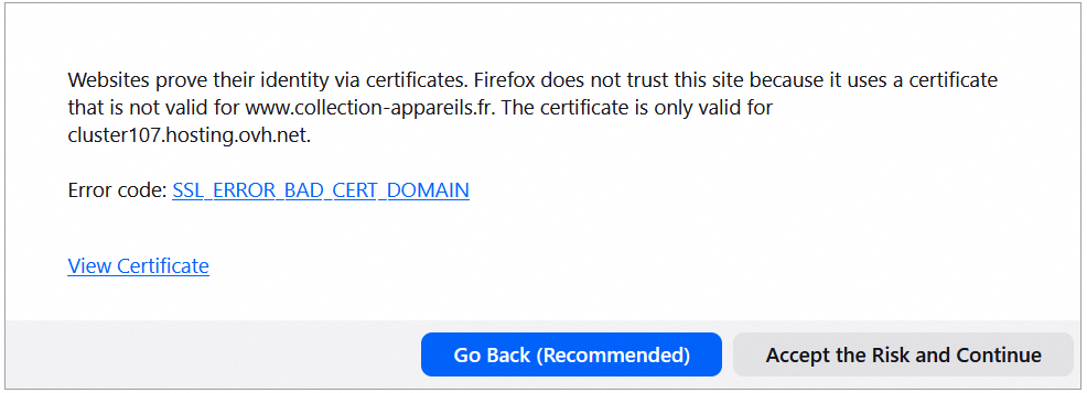 Suite à des attaques DDoS, j'essaye d'installer Cloudflare (free). J'ai modifié les serveurs DNS chez OVH pour indiquer ceux de CLoudflare. Je l'ai fait, il y a 50 mn environ. Depuis, j'ai sur certaines machines (PC ou Smarphone android) sous plusieurs navigateurs des messages comme celui-ci avec Firefox : Firefox a détecté une menace de sécurité potentielle et n’a pas poursuivi vers www.collection-appareils.fr. Si vous accédez à ce site, des attaquants po etc