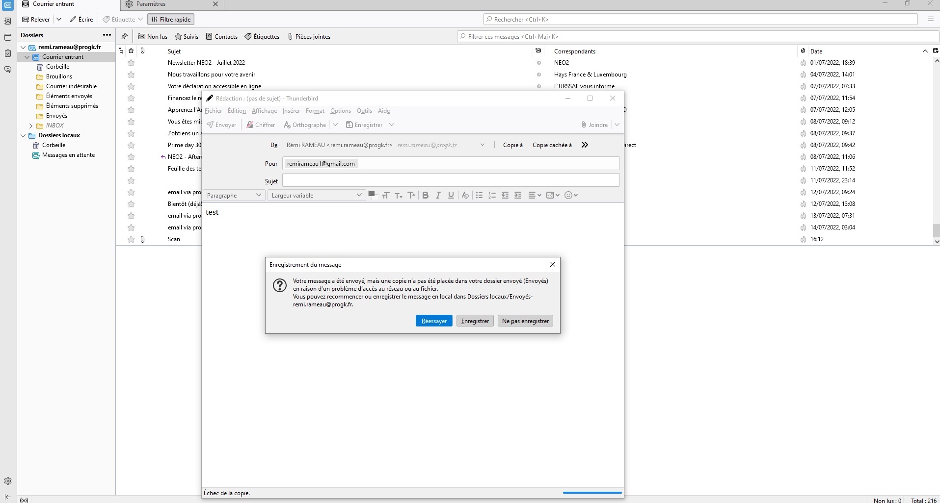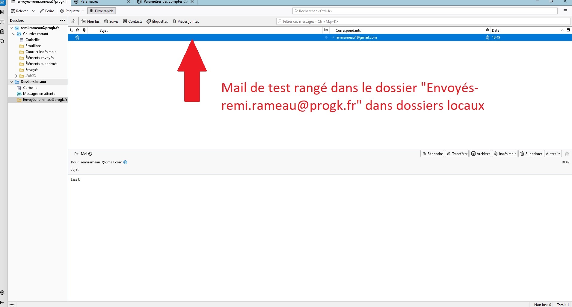 Autant pour moi ça fonctionne. Le mail de test que j'ai envoyé par Thunderbird sur mon autre adresse est bien arrivé. Le mail s'est également rangé dans mon dossier "Envoyés-remi.rameau@progk.fr" dans la partie **Dossiers locaux**.