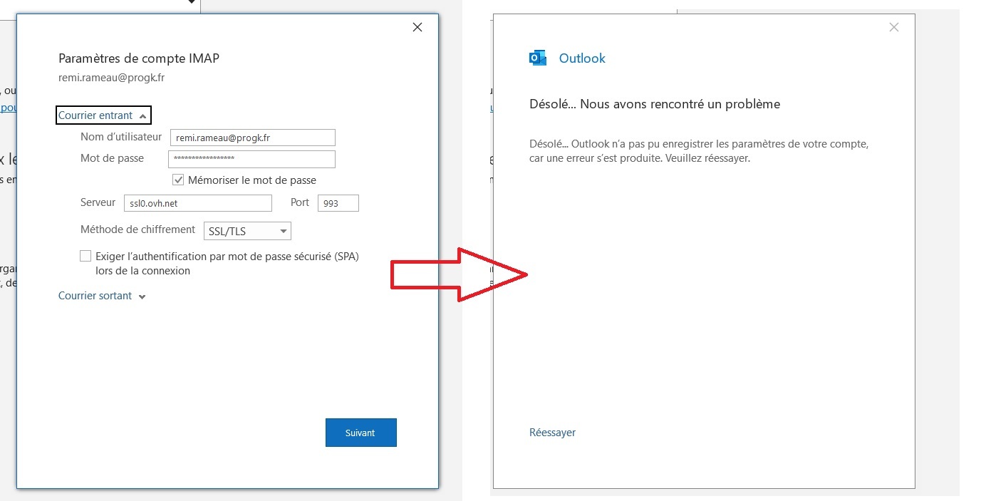 Un dernière chose le numéro de port du courrier sortant est de 465 (mais quand je tente de mettre 587 ça me met : "Désolé...Outlook n'a pas pu enregistrer les paramètres de votre compte, car une erreur s'est produite. Veuillez réessayer".