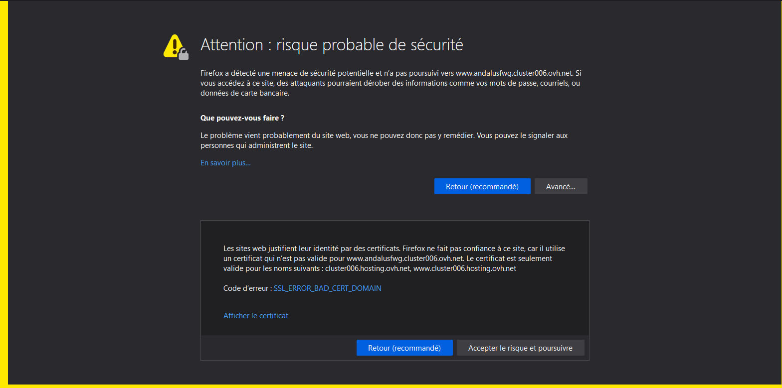 Super, cela fonctionne après avoir vidé le cache. Dernier détail, j'ai un cadenas barré en rouge pour connexion non sécurisée....