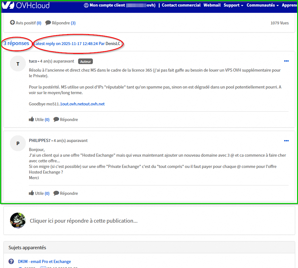 Face aux blacklistages récurrents des IPs *.mail-out.ovh.net je tente une migration vers un Private Exchange qui devrait me fournir une IP dédiée propre (j'espère).