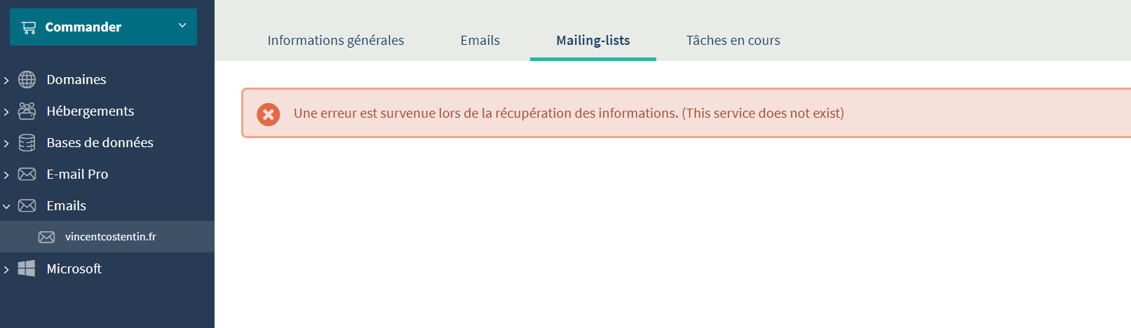Désolé pour l'image qui porte à confusion, je suis bien sur le mailing-lists de webfox.fr (Erreur : This service does not exist), mon nouveau domaine. Je suis passé sur une offre gratuite pour mon ancien domaine, et ai donc accès à l'adresse mail unique gratuite.
