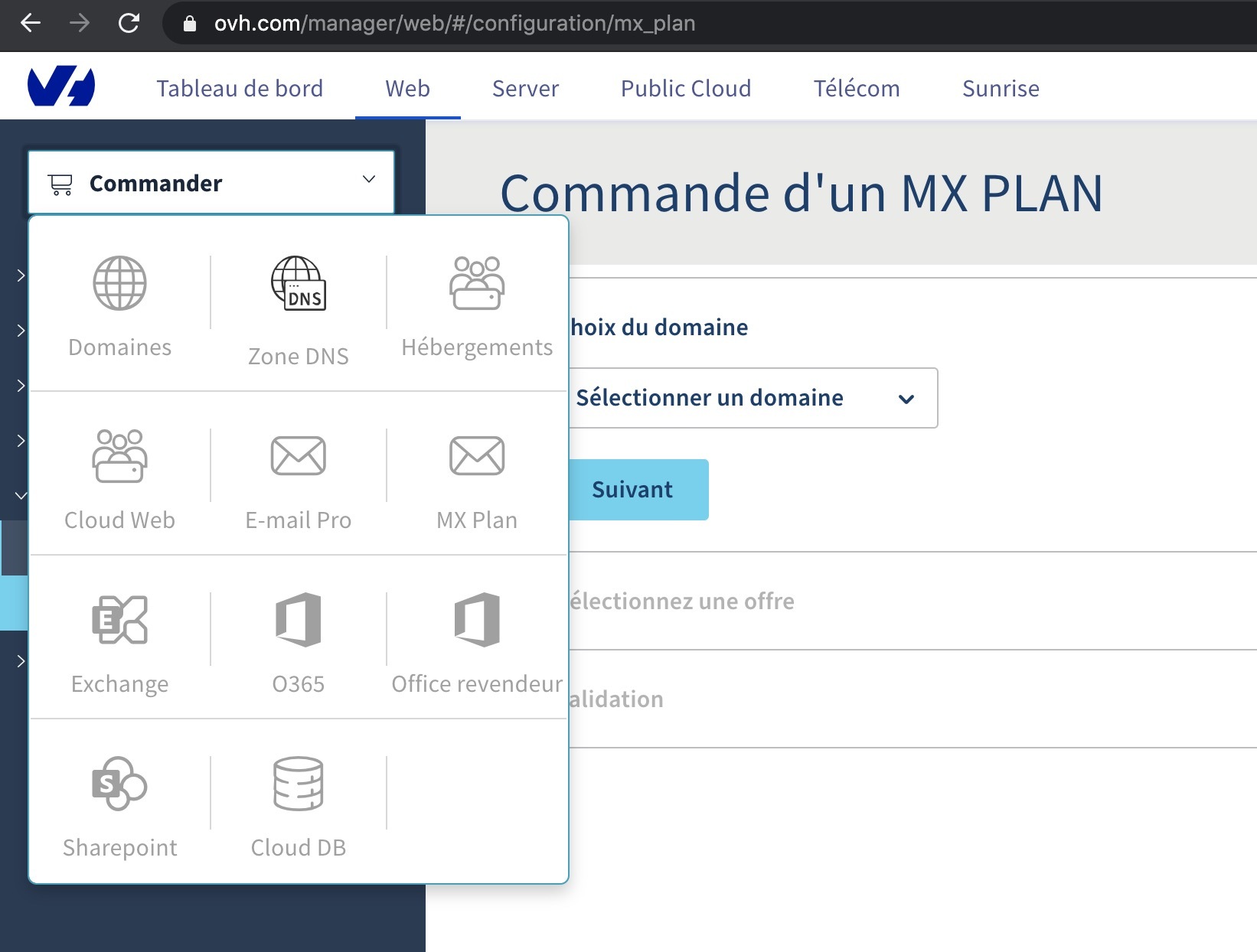 L'hébergement OVH arrive à expiration aujourd'hui (le renouvellement à été désactivé il y'a plus d'un mois), mais ca fait plus d'une semaine que j'essaye de souscrire à un MX Plan "seul", mais il ne se passe rien quand je clique sur "Sélectionner un domaine", et je suis donc incapable de commander un nouveau compte MX Plan "seul".