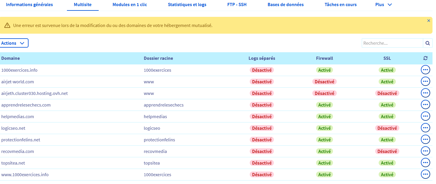 Lorsque j'essaye, ça me dit : "Une erreur est survenue lors de la modification du ou des domaines de votre hébergement mutualisé."