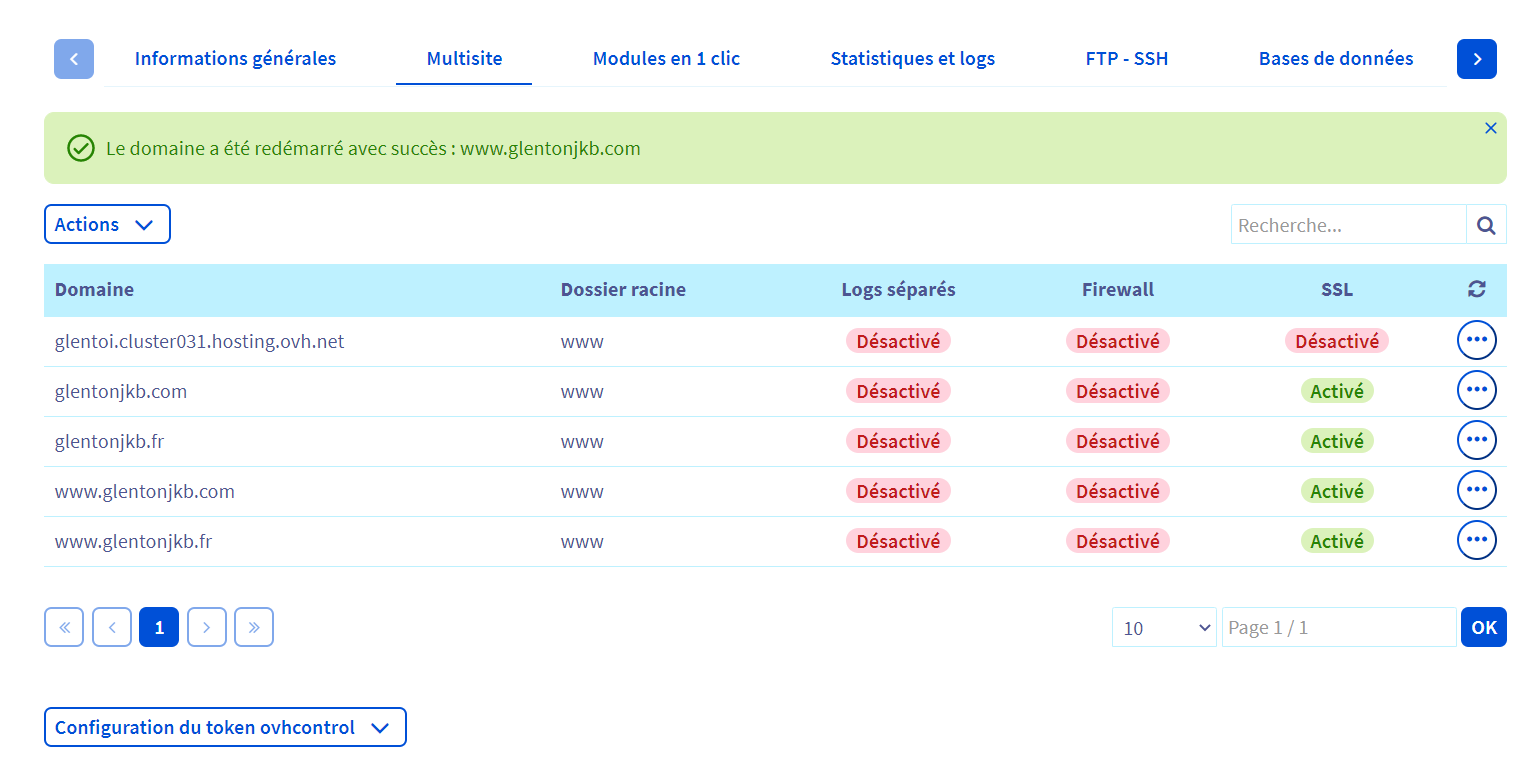 Le certificatSSL semble activé au niveau de la configuration générale et au niveau du nom de domaine: