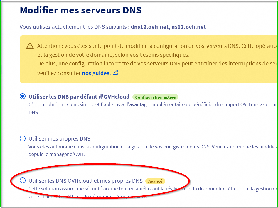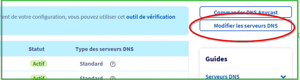 Je n’ai aucune option dans l’interface pour modifier ces serveurs DNS, ni pour revenir aux serveurs OVH. Le bouton pour changer les DNS n’apparaît pas. Et je précise que je n'ai pas de connaissance particulières donc je suis assez perdu.