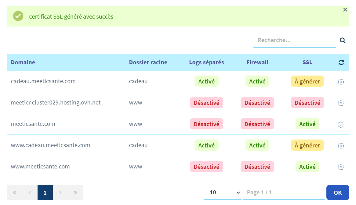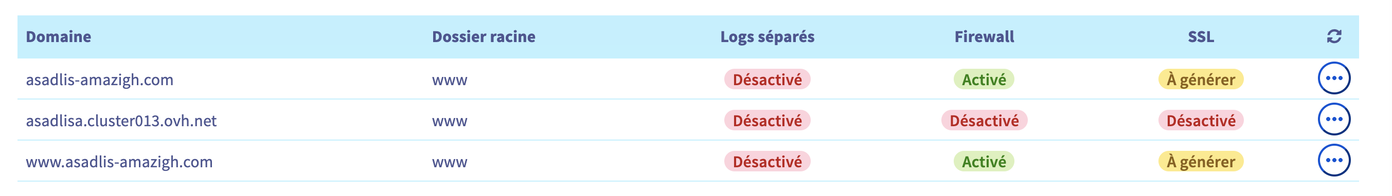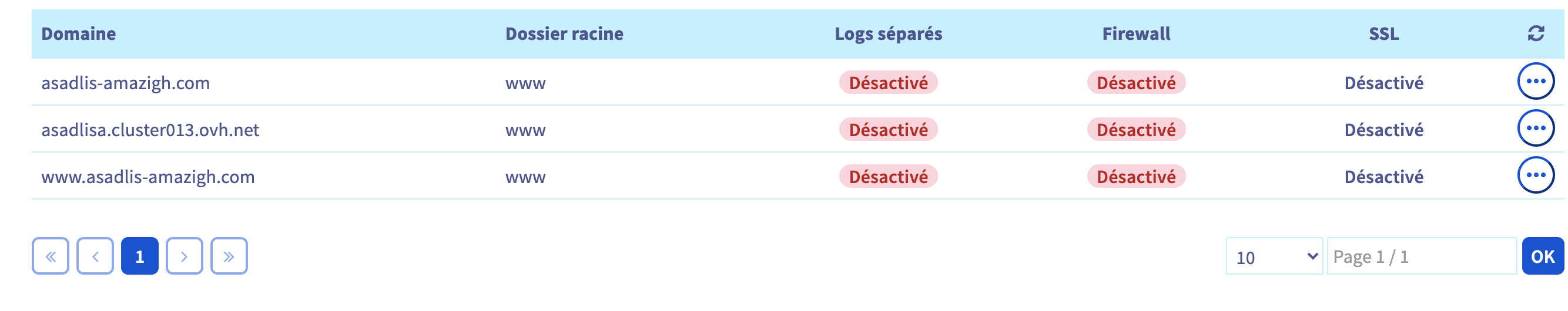 J'ai réinitialisé. Apres Je suis retourné dans hebergement/multisite. J'ai obtenu le resultat en piece jointe. Le premier ne passe pas et il y a un message d'erreur: Une erreur est survenue lors de la modification du ou des domaines de votre hébergement mutualisé.