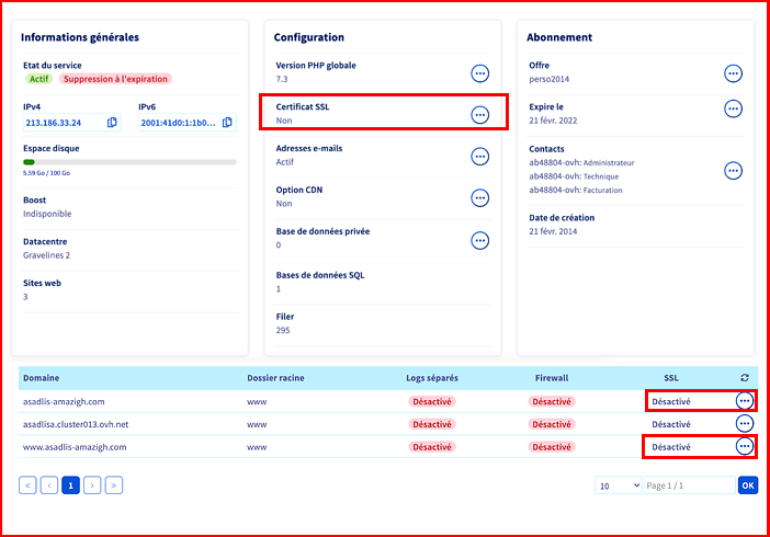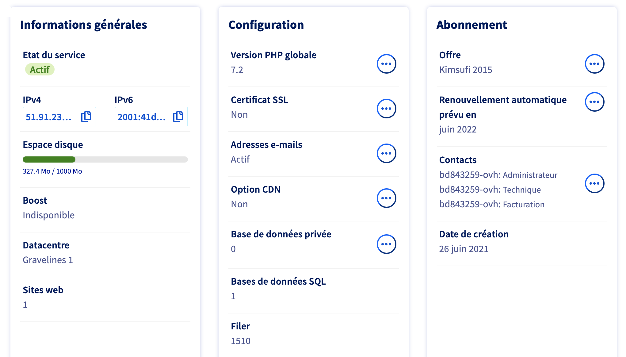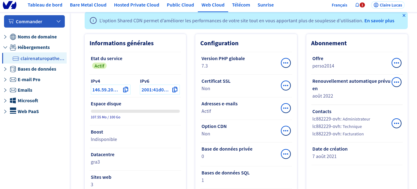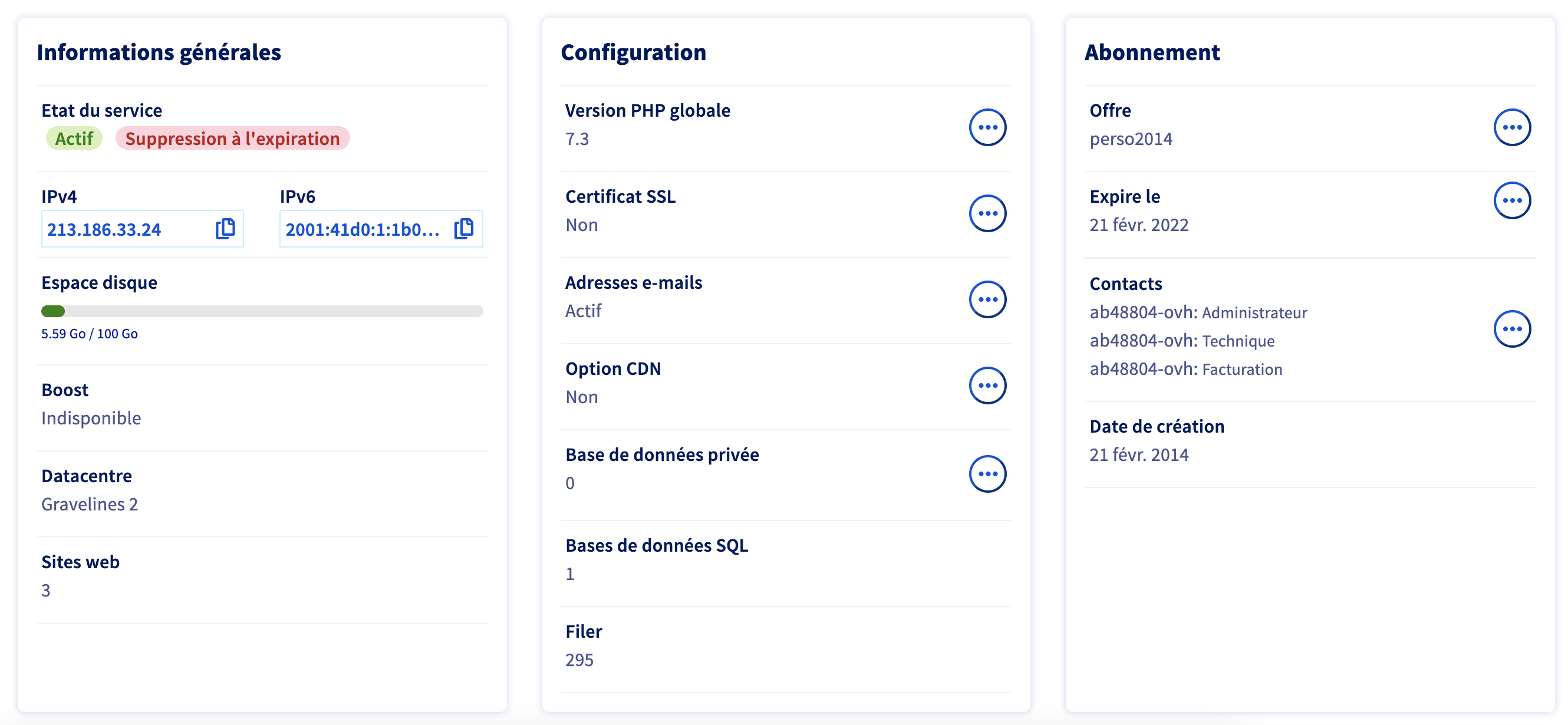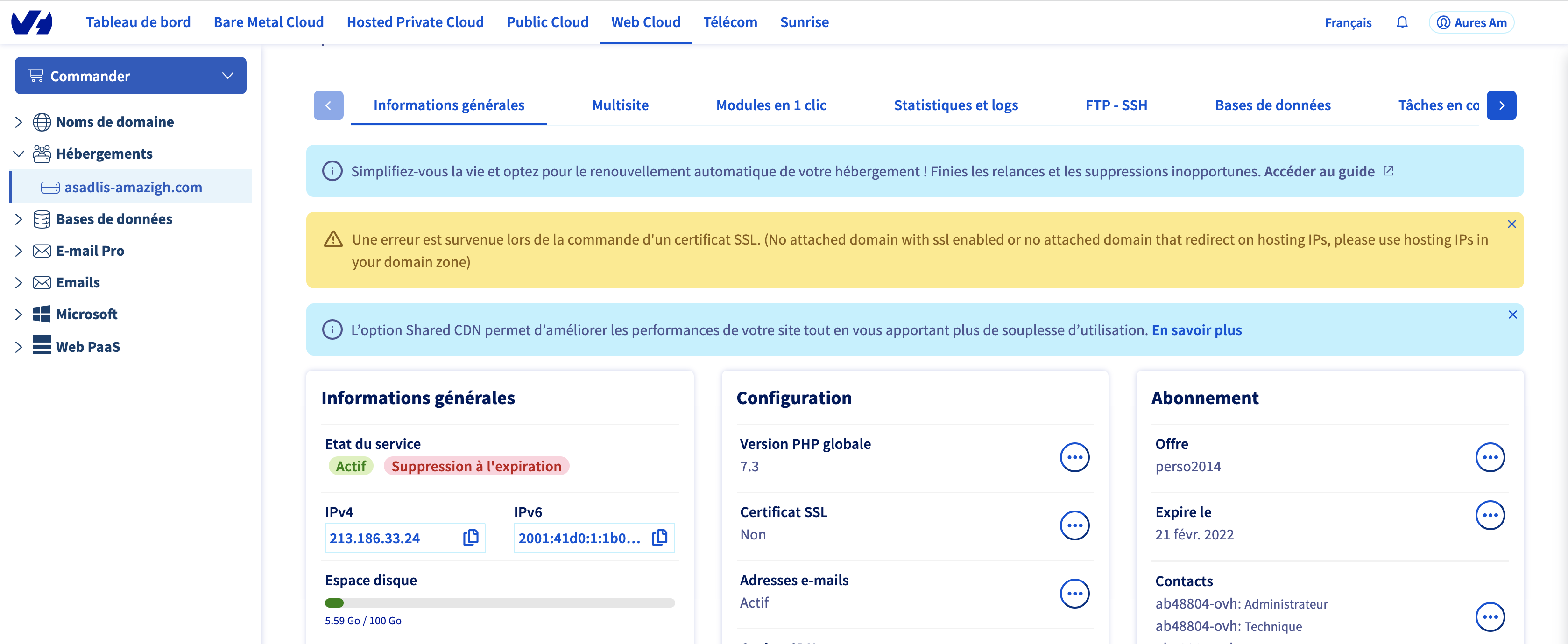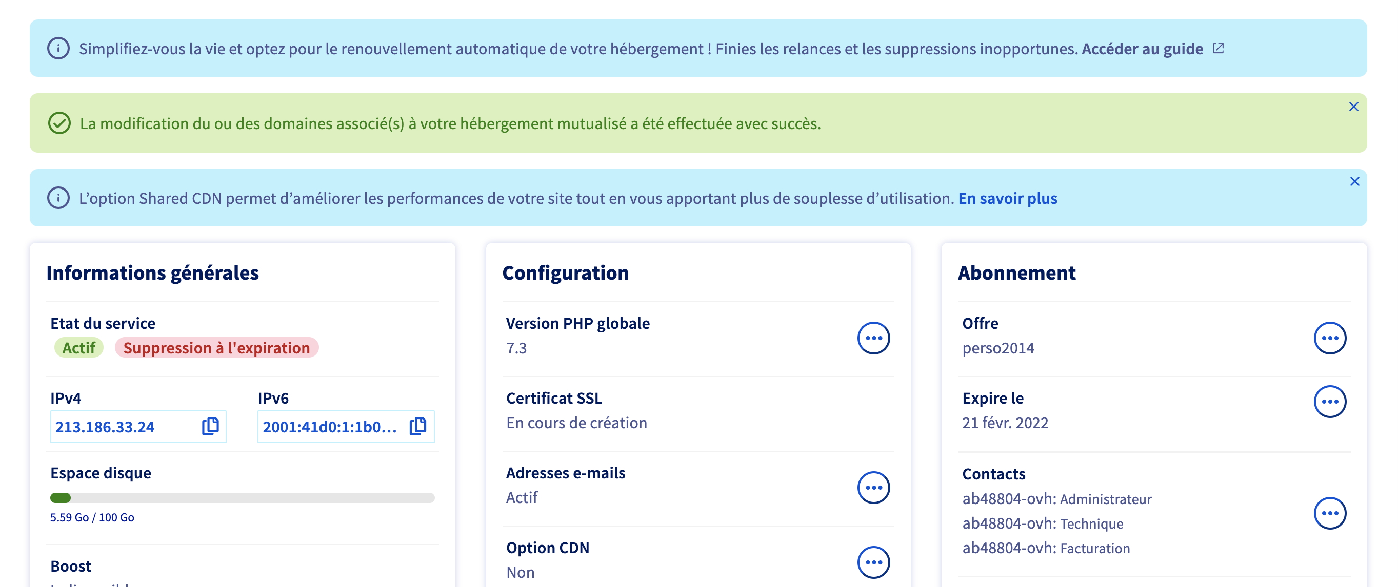 **Manager OVH > Web Cloud > Hébergement > VotreDomaine > Informations générales**