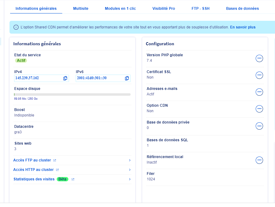 SVP montrez une copie d'écran de la page Hébergement > Multisite et une copie d'écran de la page Hébergement > Informations générales