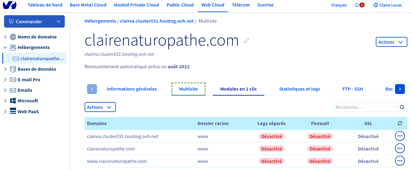 Ensuite il faudra d'abord activer l'option SSL pour chaque ligne (clairenaturopathe.com) depuis Hébergement > onglet "Multisite".