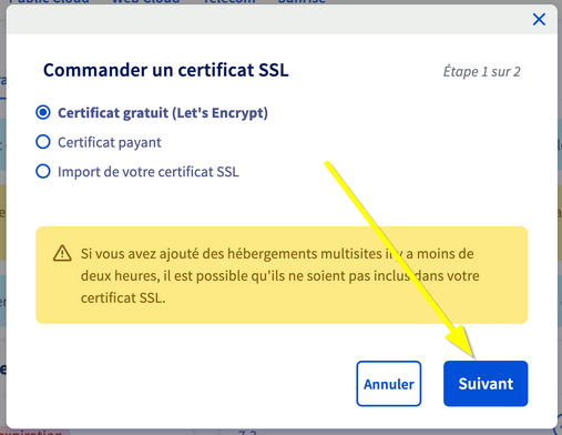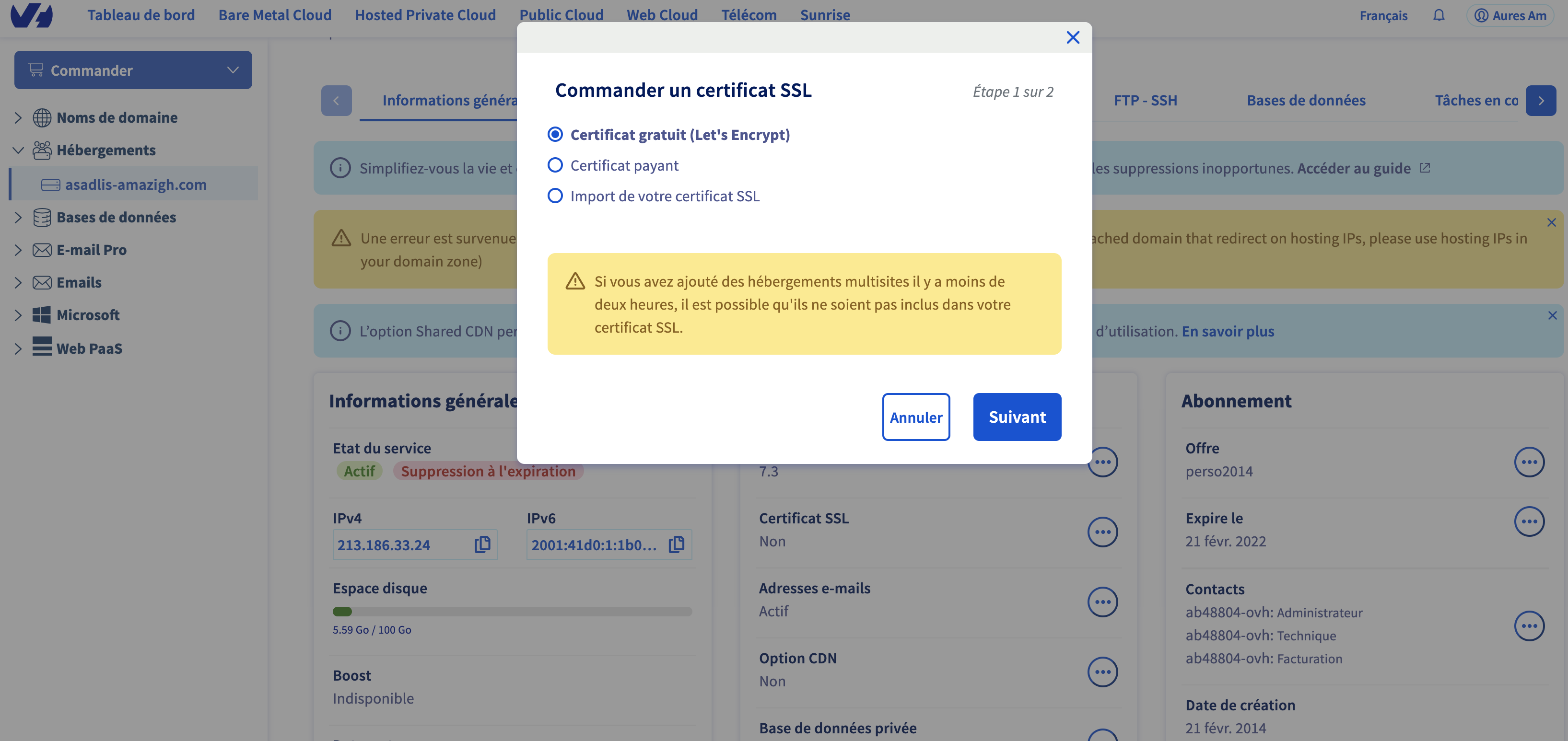 Il m'affiche l'erreur suivante : Une erreur est survenue lors de la commande d'un certificat SSL. (No attached domain with ssl enabled or no attached domain that redirect on hosting IPs, please use hosting IPs in your domain zone)