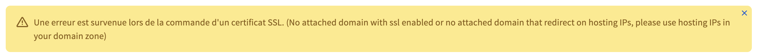 J'ai toujours le même message d'erreur : _Une erreur est survenue lors de la commande d'un certificat SSL. (No attached domain with ssl enabled or no attached domain that redirect on hosting IPs, please use hosting IPs in your domain zone)_