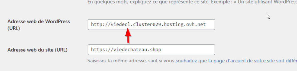 Pour l'instant j'ai modifié sur wordpress>reglages adresse web et url sur https://viedechateau.shop