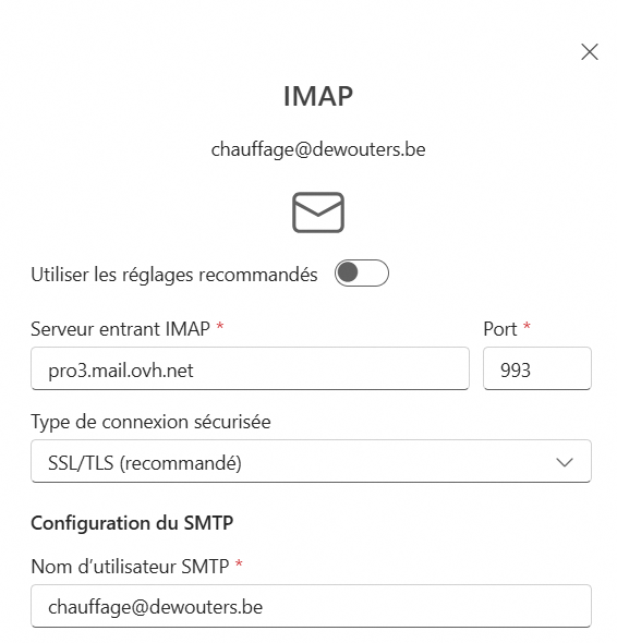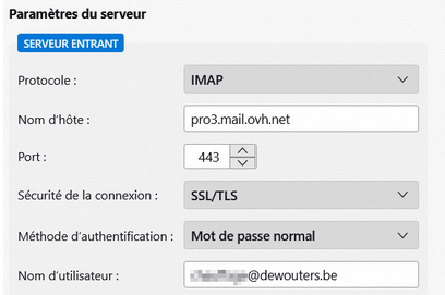 Entrant IMAP: https://pro3.mail.ovh.net/ sur port 993, en SSL/TLS