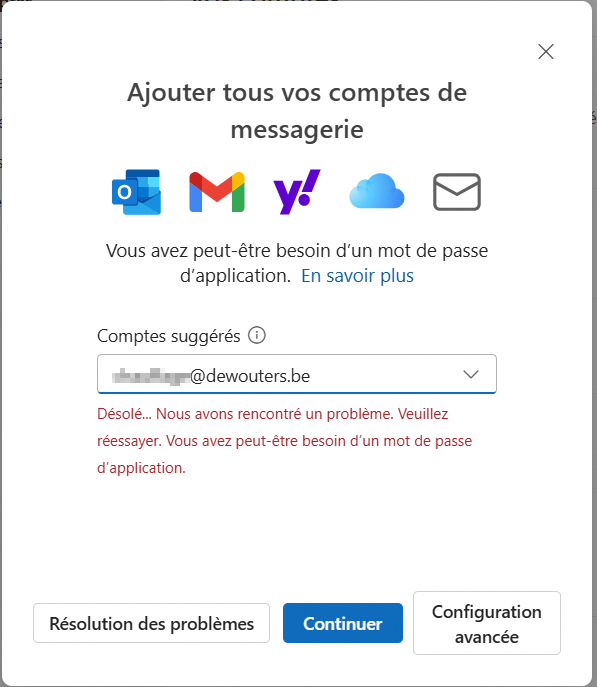 Après avoir cliqué sur "Continuer", l'erreur suivante apparait: "Désolé... Nous avons rencontré un problème". Veuillez réessayer. Vous avez peut-être besoin d'un mot de passe d'application".