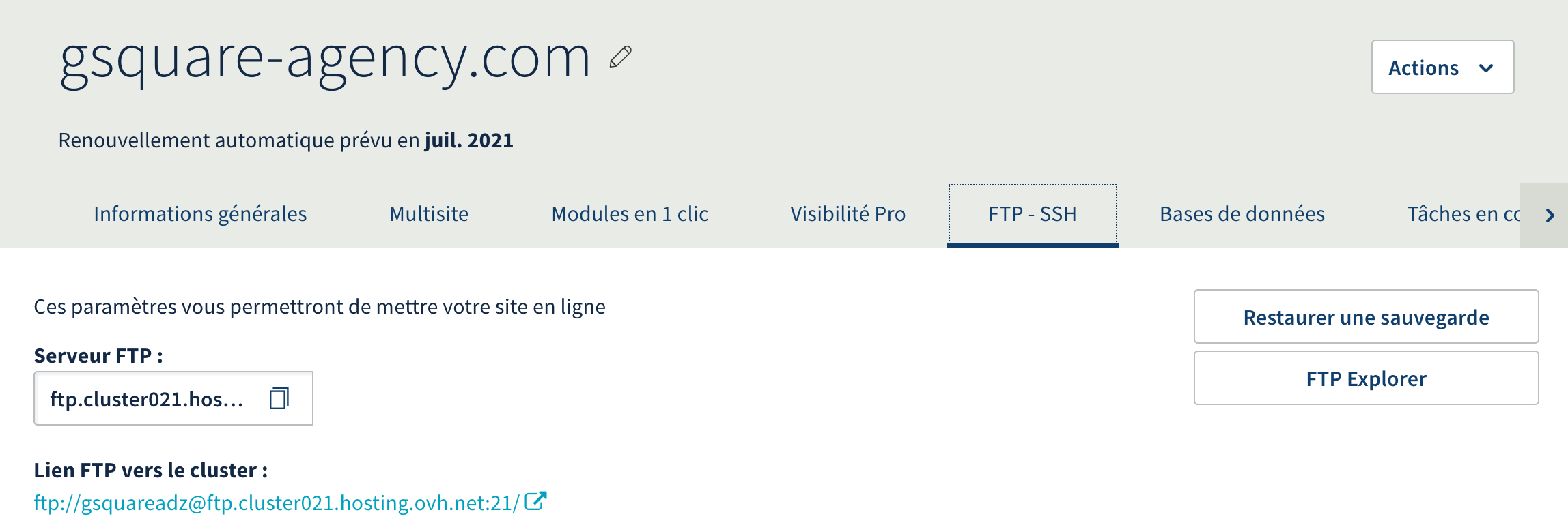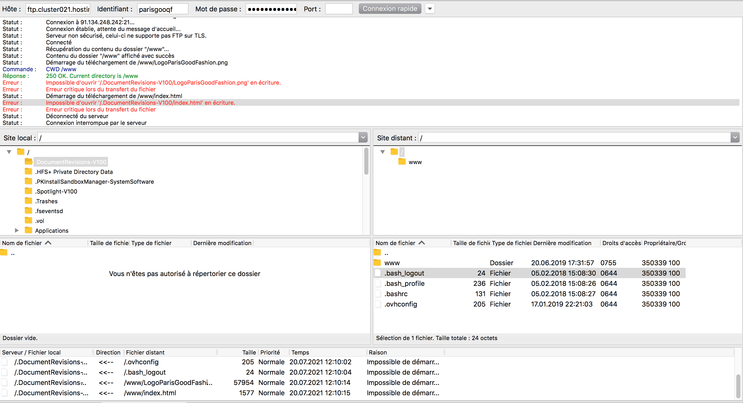 Je me suis dit qu'il fallait que j'accède aux fichiers de mon site V.1. donc j'ai essayé de me connecter avec FTP en utilisant les données fournies par OVH.